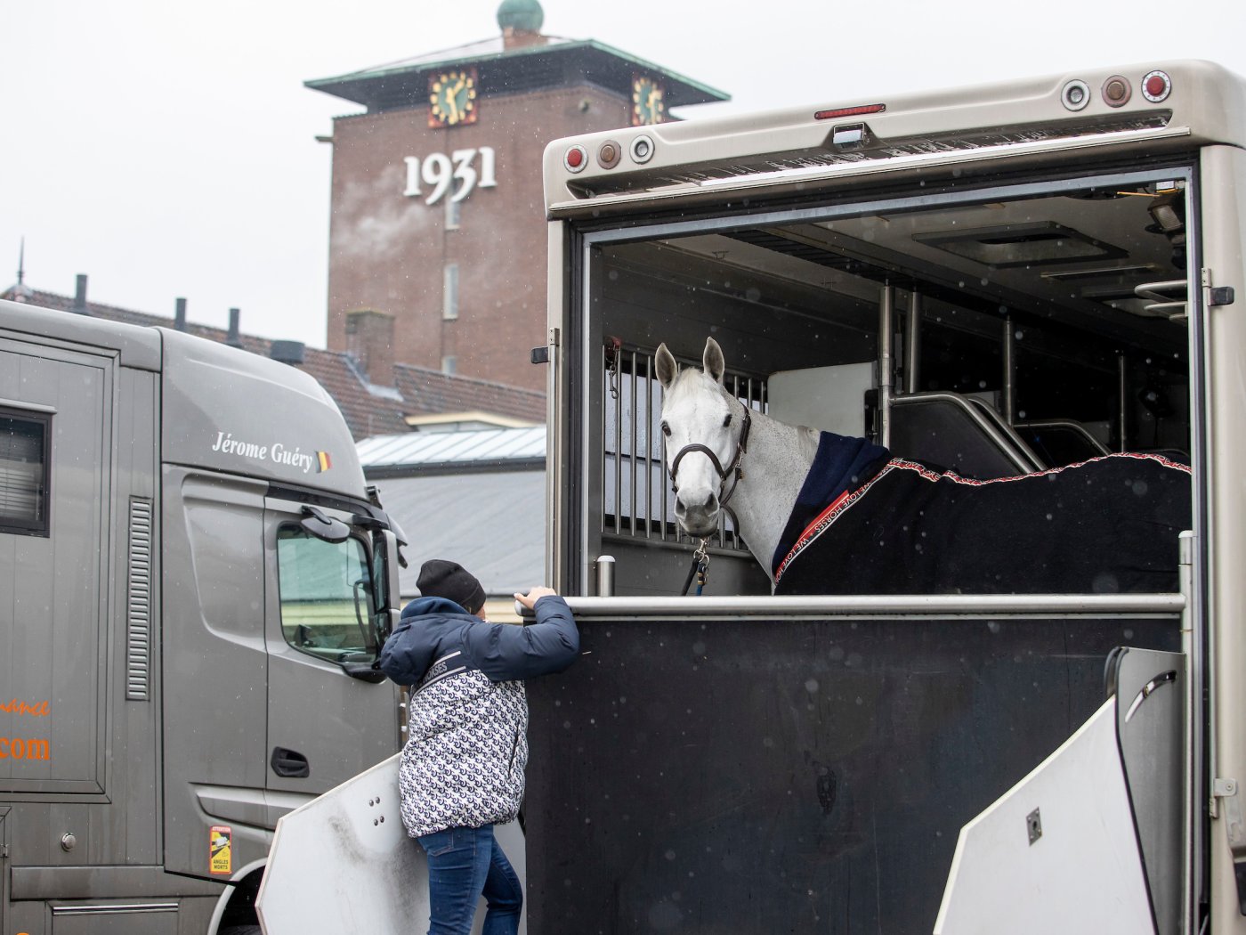 “Om de vliegreis voor de paarden zo aangenaam mogelijk te maken, geef ik ze altijd twee dingen. Eerst krijgen ze slobber (Fiber Mash Lannoo) met elektrolyten (Cavalor Electroliq Balance or Electrolyte Balance) waardoor ze gehydrateerd blijven, vervolgens krijgen ze een uur voor de vlucht nog een tube Gastro Aid (Gastro Aid Paste) en slobber”, vertelt Coline, showgroom van Olivier. “Tijdens de vlucht hebben de paarden toegang tot een emmer water en twee hooinetten (van Rubco). Tenzij we ’s nachts vliegen, dan krijgen ze geen hooi omdat ze thuis ’s nachts ook geen hooi krijgen en het is goed om dezelfde routine te bewaren. Wijzelf kunnen tijdens de vlucht ook niet bij het volledige paard, alleen bij hun hoofd. Wanneer we terug geland zijn krijgen de paarden opnieuw een tube Gastro Aid en slobber.”